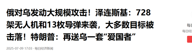 每日经济新闻——俄对乌发动大规模攻击!泽连斯基:728架无人机和13枚导弹来袭,大多数目标被击落!特朗普:再送乌一套“爱国者”——2025-07-09