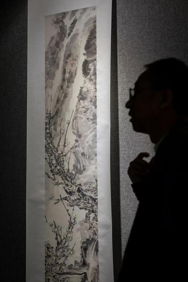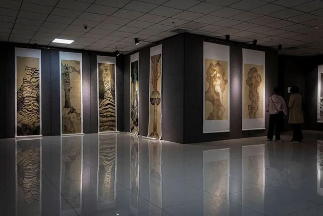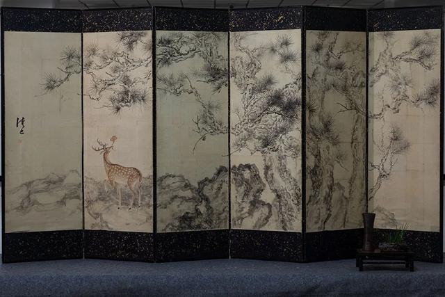 展厅现场,一幅高1米75、长3米6的《老松瑞鹿》古屏风引发观众驻足。作者在百年以上的老素屏上用苍劲的淡墨线条勾勒晕染为老物件赋予新的生命,是对传统文脉的深情回望。参观画展的观众争相在屏前拍照留念,该作品已被伊顺美术馆馆藏。