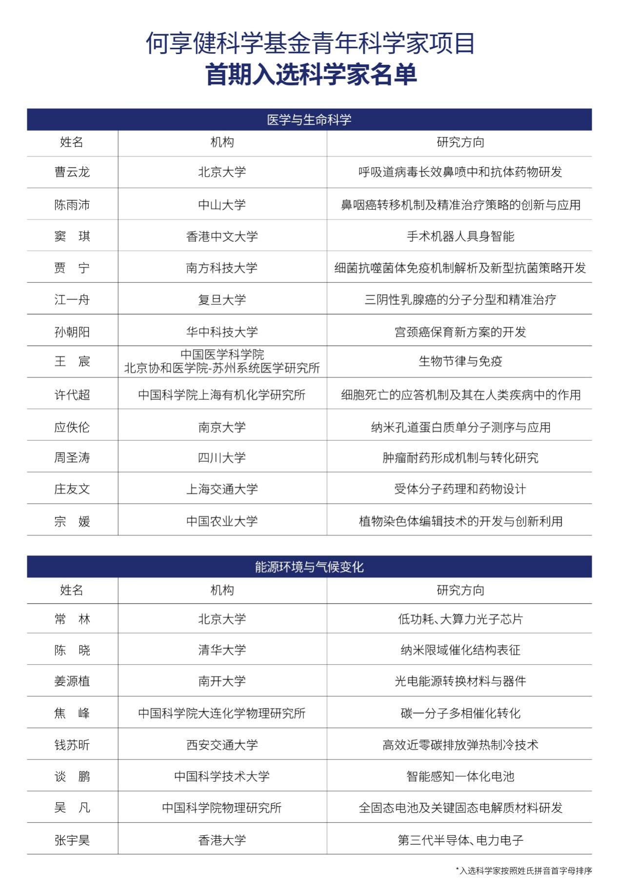 本次入选的20位青年科学家涵盖两大重点领域,其中医学与生命科学领域12人、能源环境与气候变化领域8人。具体名单如下:
