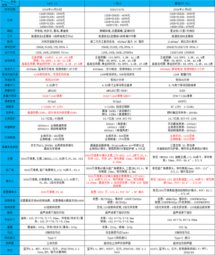 如果想要性能、影像、屏幕和续航等兼顾的话,并且预算充足的话,一加13可以是首选;而如果想要同等的性能、后置影像,更强的续航和屏幕亮度以及护眼,最重要的是更看重性价比的话,那么真我GT7 Pro是妥妥的不二之选;至于主要侧重手游体验,对后置影像并没有很高的需求,那么iQOO13则是可以考虑的选择。