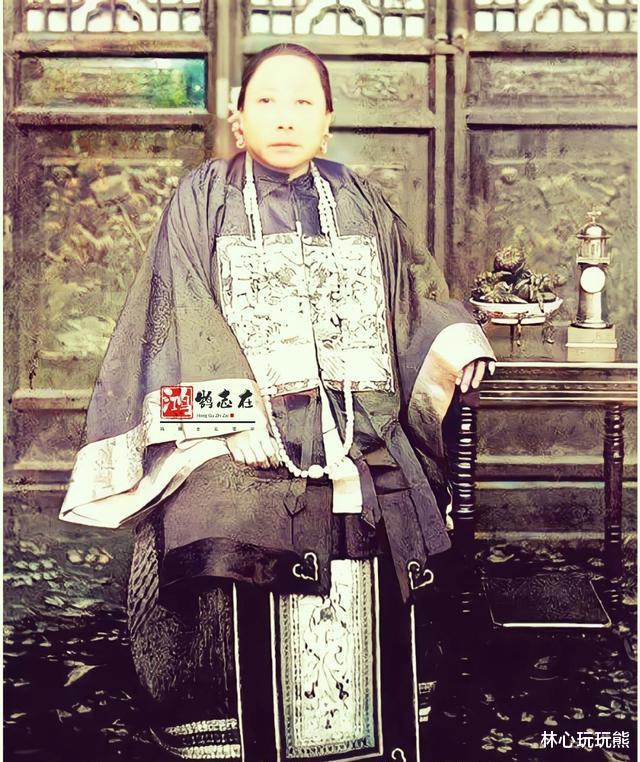 慈禧太后的照片经过放大和上色处理,全身珠光宝气闪耀。细看她的脸,表情非常细腻。尽管已经六十多岁,眼袋显得有些松弛,但她的眼神依旧锐利无比。