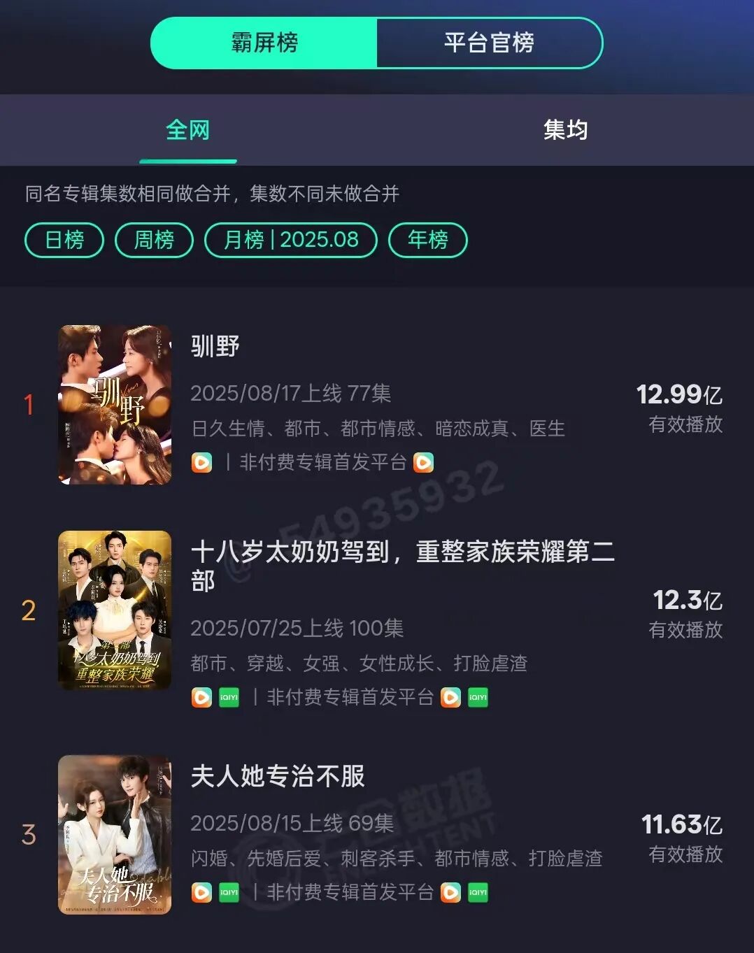 暑期,有“短剧女尊赛道一姐”之称的王小亿主演的《云渺》第三、四部的播放成绩没有预想中高。不过,东方不亮西方亮,云合数据显示,本周排在红果周榜第一的《驯野》有效播放量已突破10亿,排名也较上周上升一名。
