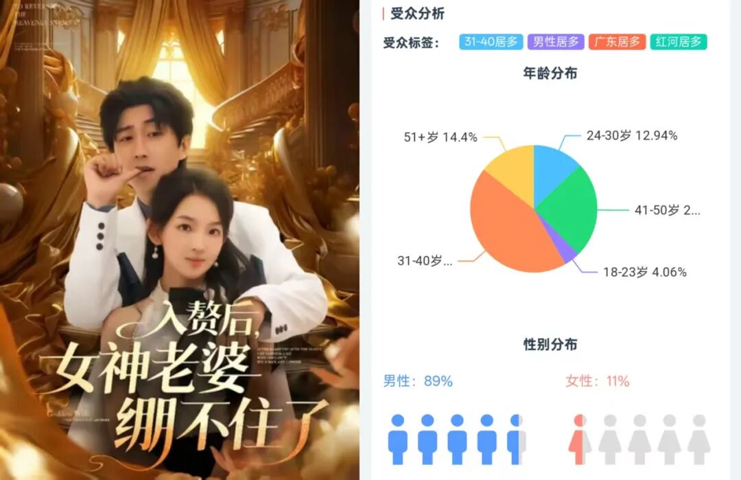 这两部剧在受众分布上都以男性为主,《入赘后,女神老婆绷不住了》的男女观众比例甚至达到了89%和11%,年龄层则以30-50岁的男性居多。