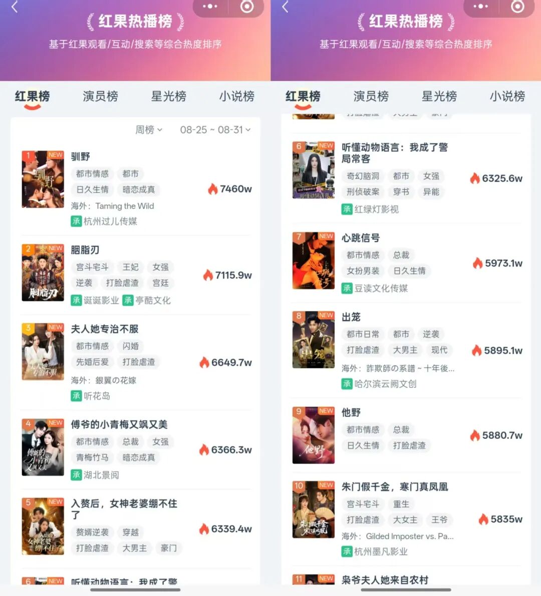 暑期档之后,竖屏短剧的热度并未降低,本周各个题材均有爆款出现,红果10亿俱乐部再添新成员。