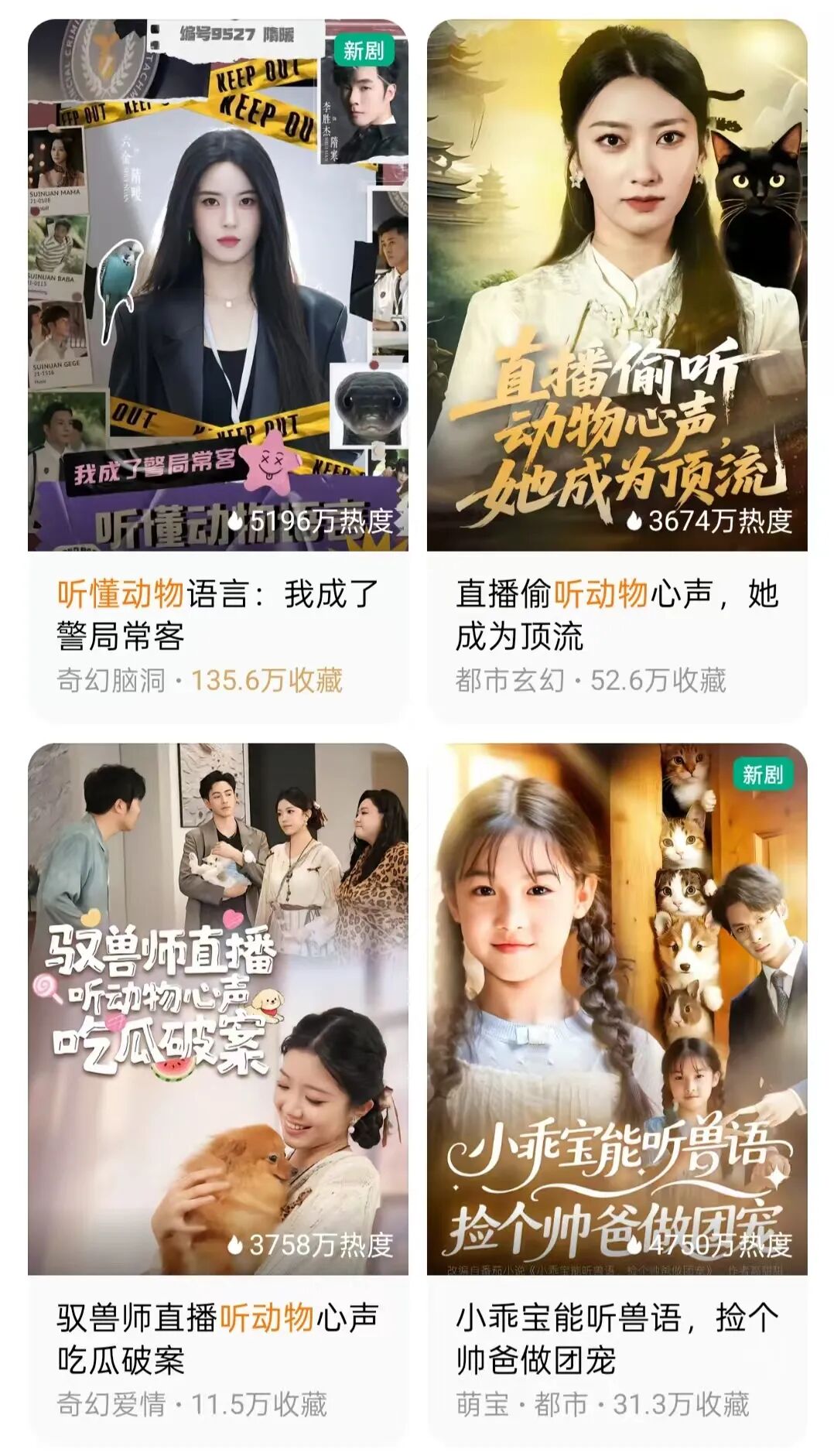 类似的短剧还有《直播偷听动物心声,她成为顶流》《驯兽师直播,听动物心声吃瓜破案》等。继“萌娃指点江山的”题材之后,奇幻+悬疑+动物心声这条赛道,也是被短剧给闯出来了。