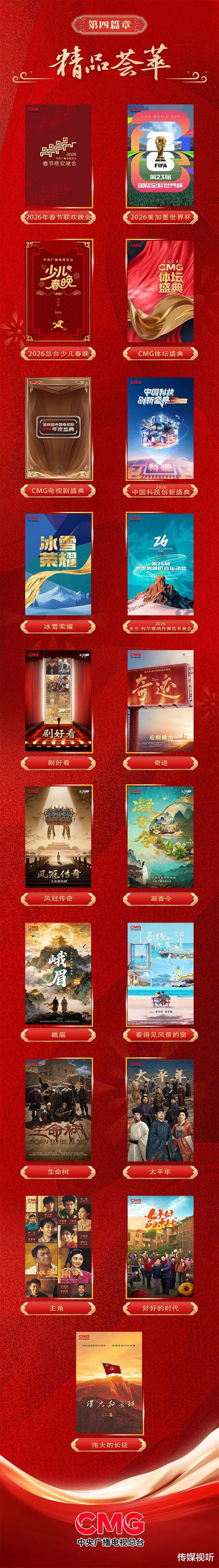 “精品荟萃”篇章汇聚总台电视剧、大型晚会、纪录片、重大赛事等各类节目,以满屏佳作彰显旗舰频道担当。总台首部原创自制精品短剧集《奇迹》展现深圳经济特区成立以来波澜壮阔的发展历程;首次推出的文艺访谈节目《剧好看》以创新形式推介总台大剧,深度解读作品艺术价值与时代精神;《凤冠传奇》《凝香令》《峨眉》《看得见风景的窗》等系列文化微短剧,分别聚焦明代宫廷传奇、中医文化传承、守护峨眉山水和海岛诗意生活等主题。2026年,综合频道还将播出《生命树》《太平年》《主角》《好好的时代》《伟大的长征》等电视剧,以匠心打造的精品剧集,持续为观众带来高品质的观剧体验。《2026年中央广播电视总台春节联欢晚会》《2026年中央广播电视总台少儿春晚》等大型晚会将继续陪伴观众欢度佳节,《CMG电视剧盛典》《2026中国科技创新盛典》《CMG体坛盛典》等年度盛典精彩纷呈;体育赛场同样令人期待,2026米兰冬奥会、2026美加墨世界杯等国际顶级赛事将带来激情澎湃的竞技盛宴。