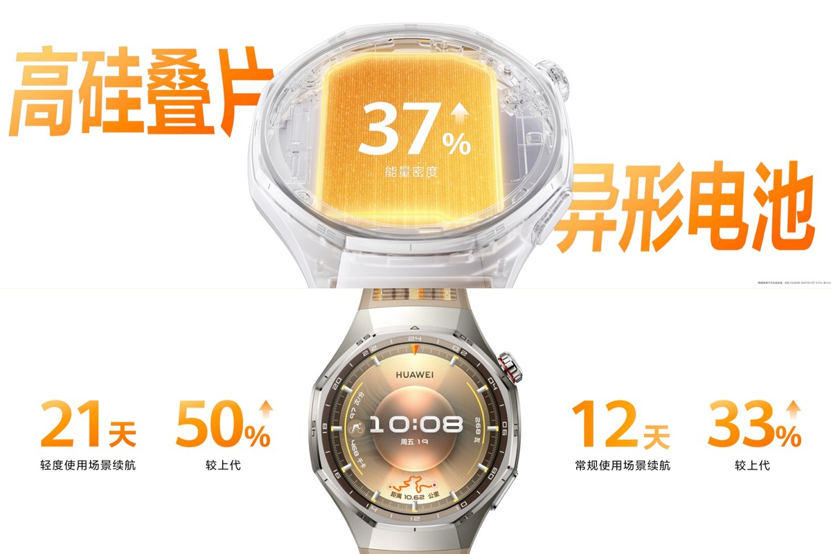 续航低是智能手表的通病,但华为WATCH GT 6系列它不是靠牺牲功能换续航,而是从电池技术底层突破:它采用了行业首创的高硅叠片异形电池技术,密度提升37%,相同体积能多储电;空间利用率提升26%,小表盘也能装大电池;Pro款867mAh电池,更是华为智能手表的容量纪录,这些系列的升级,直接将这块手表的续航拉满至21天,直接把续航拉到了新高度。