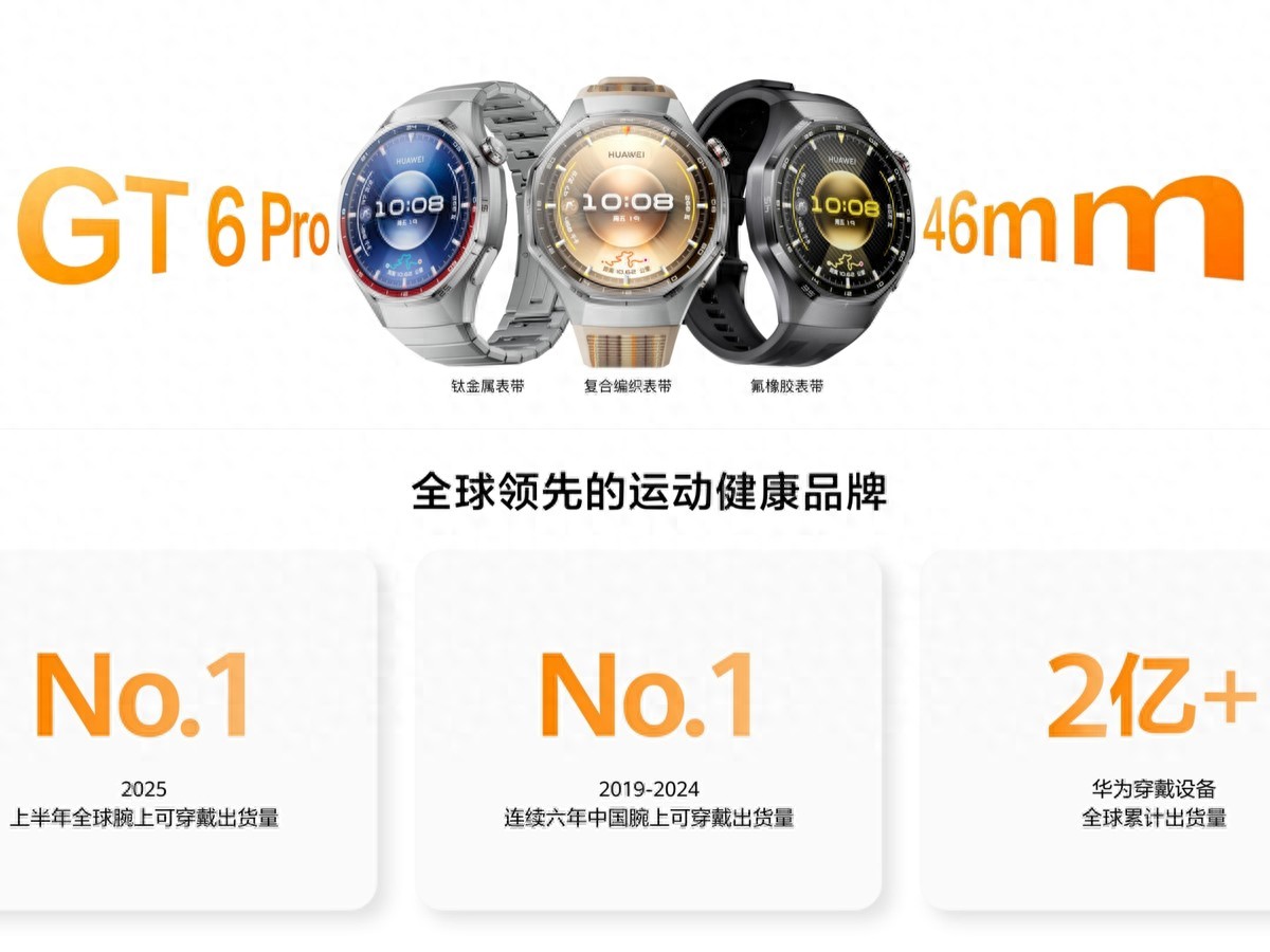 这款9月24日发布、定价1488元起的“超长续航颜智实力派”,背后还有两大硬核背书:《TIME》2025年度最佳发明榜单中,HUAWEI Watch GT 6 Pro成唯一入选的中国智能手表;IDC数据显示,华为以20.2%份额登顶全球腕戴市场,这说明了每五台智能手表就有一台来自华为。