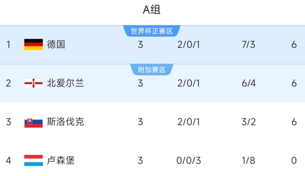 本轮战罢,世界杯欧洲区预选赛积分榜更新,德国暂列A组第一,法国领跑D组,各支球队为出线资格展开激烈争夺。