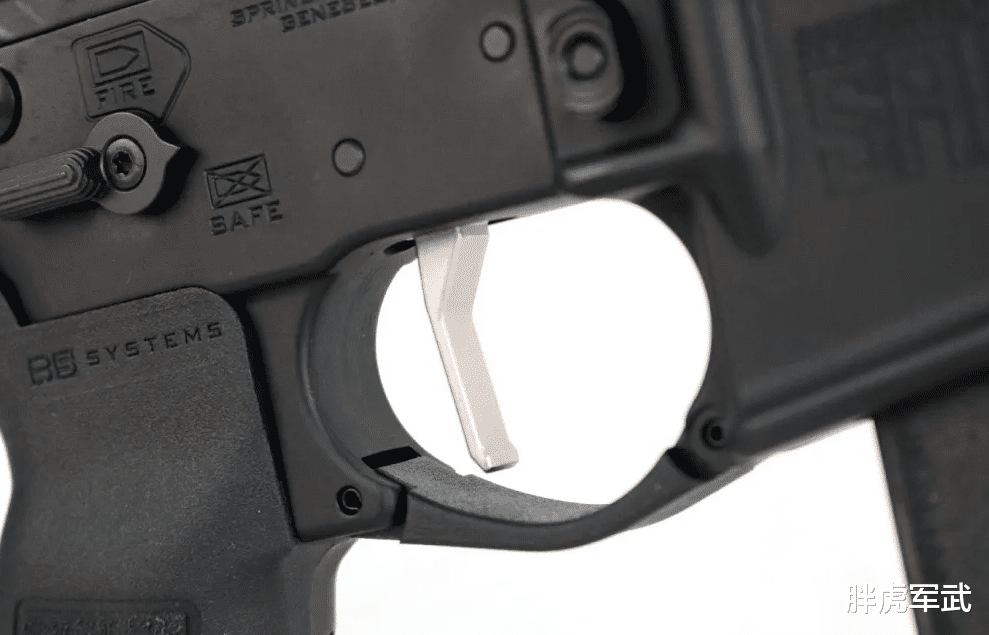 超大的聚合物扳机组来自B5 Systems,并搭配B5 Systems Type 23 P-Grip握把和45度双向安全装置。B5握把的握把与机匣角度比传统M4握把更为倾斜,这种设计有助于将持枪手的肘部紧密贴合身体。护木上还提供了充足的M-Lok附件接口。