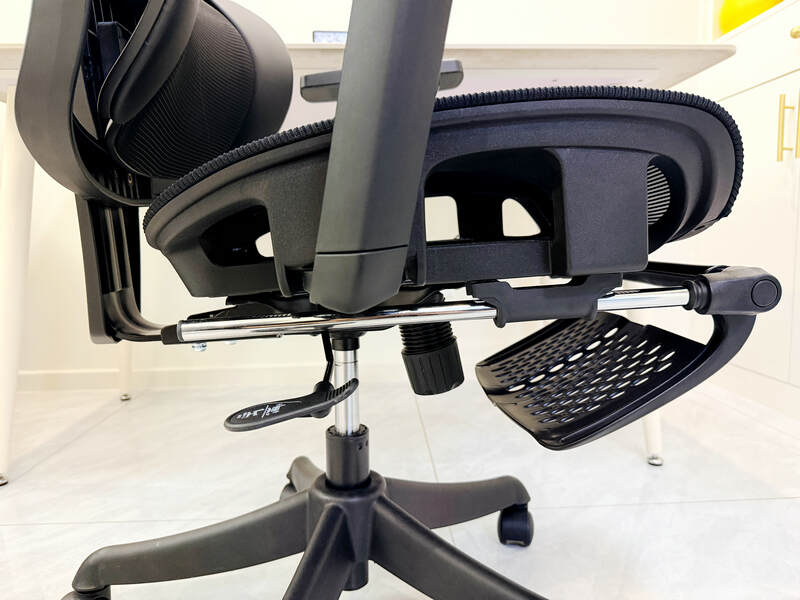 夏草木 Fit2 人体工学椅的升降功能和后仰躺坐是通过坐垫下方的调节把手完成,调节方式为上抬操作,下压固定,抽拉后仰,操作是非常方便的。