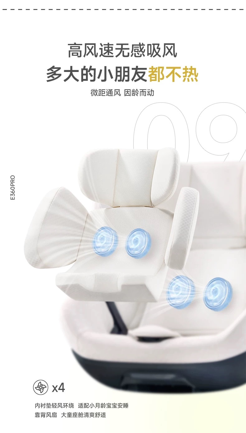 虎贝尔 的通风系统是一个集成化的主动解决方案。以 虎贝尔E360Pro 为例,其搭载了四风道集成吸风风扇。与普通吹风模式不同,吸风模式能更高效地将孩子背部和臀部的湿热空气“抽走”,形成体表微循环。座椅面料层采用5mm微距通风设计,在保证支撑性的前提下最大化空气流通效率。整个电路系统采用5/12V超低压供电,并从物理结构上实现IPX5级工业防水,杜绝因液体泼溅导致的短路风险。