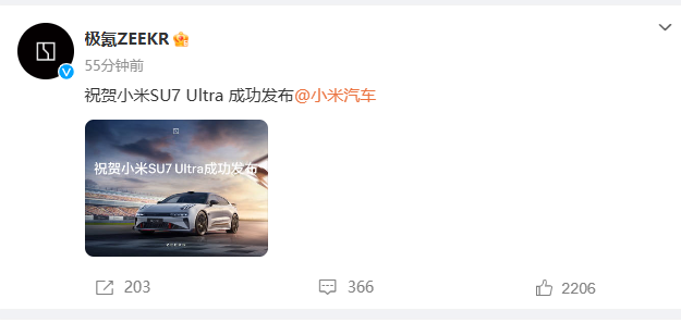 从比亚迪喊话“中国汽车在一起”,到今天极氪保留争议微博,再给小米SU7 Ultra发来贺电祝福,足以看到极氪品牌这波操作格局之大。