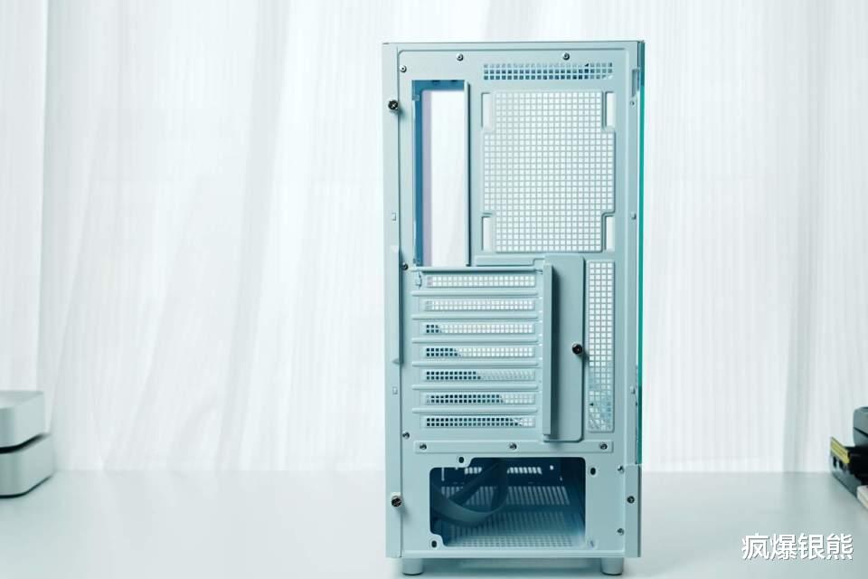 机箱后面采用了标准设计,顶部是风扇和主板接口位,底部是标准ATX电源位,显卡支持横放和侧方。