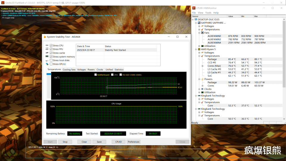 散热表现方面,得益于半岛铁盒沧溟机箱屏显版(ATX)优秀的风道和冰脉360一体水冷散热器超强的散热性能,在CPU和显卡双烤情况下,电脑表现稳如老狗。处理器最高温度稳定在62°C左右。内存温度,主板温度,SSD温度稳定在41-42°C左右,显卡温度则稳定在51°C左右。而风扇转速则只有700-800转左右,水冷泵转速2581已处于全力状态。