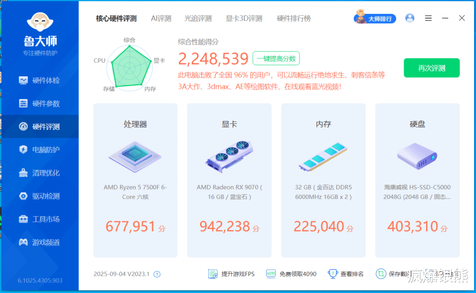 展示完后咱们看一下这一套配置的性能和稳定性表现,如上图,鲁大师跑分接近225W,超过全国96%的用户。
