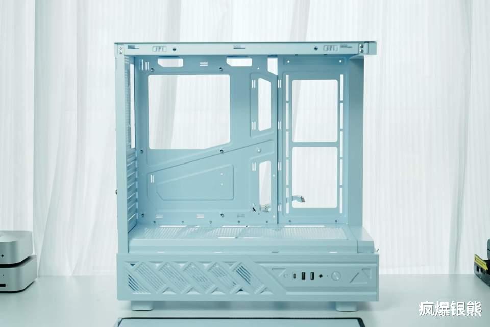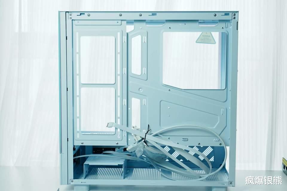 拆掉背板后机箱效果如上图,底部最左侧是2.5/3.5英寸硬盘安装位子,最多支持两个3.5英寸机械硬盘。右侧底部电源安装位置预留的很充足,方便我们把多余的线缆收纳在这里。主板位置厂家也设计了加强筋,确保机箱的稳固性。