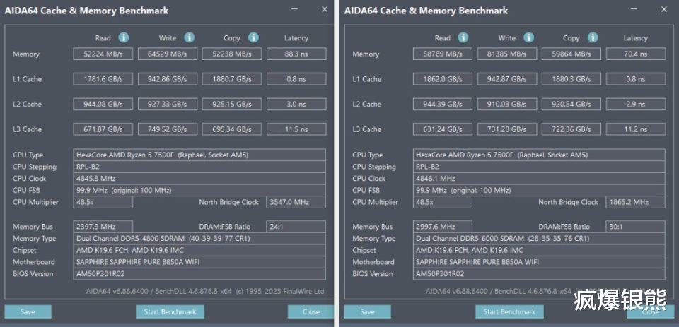 性能方面,不开EXPO的情况下,默认频率是4800MHz,读速为52224MB/s,写入64529MB/s,拷贝52238MB/s,延迟88.3ns,开启EXPO后频率直接6000MHz拉满。此时读取达到了58789MB/s,写入81385MB/s,拷贝59864MB/s,延迟低至70.4ns 。如果你会自己压小参,就金百达星刃DDR5这优秀的体质,不锁电压和时序的设置而言,性能还可以更强。