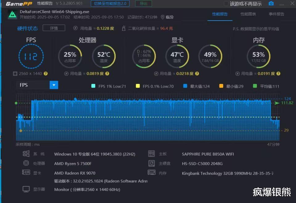 游戏表现方面,这里以最近我跟朋友超沉迷的《三角洲行动》为例,2K最高画质下,从GamePP性能报告能看出,这一套组合应对3A游戏大作还是很可以的,帧率始终稳定在120以上,处理器平均温度只有52,显卡温度更低只有47。