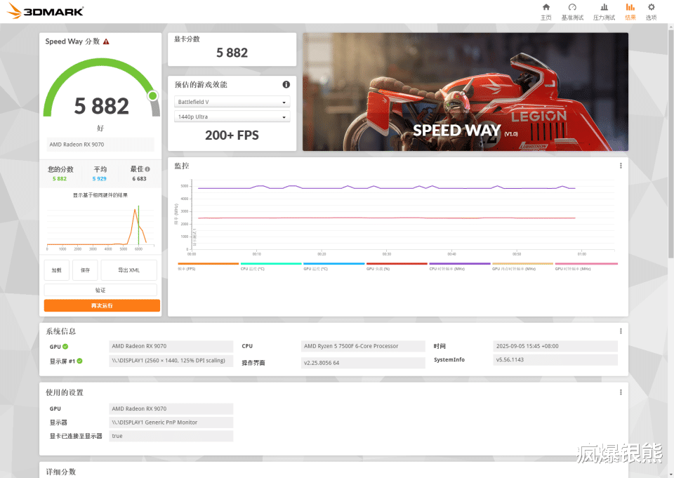 游戏性能方面,这里用Speed Way做了测试,综合得分5882,预估2K分辨率下玩战地5能达到200多帧。