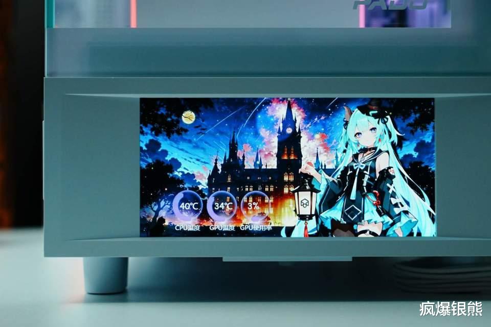 虽然不带屏,但是这款水冷的炫彩光效在颜值上个人超喜欢,多重镜面营造的空间立体感是屏幕效果不能媲美的。