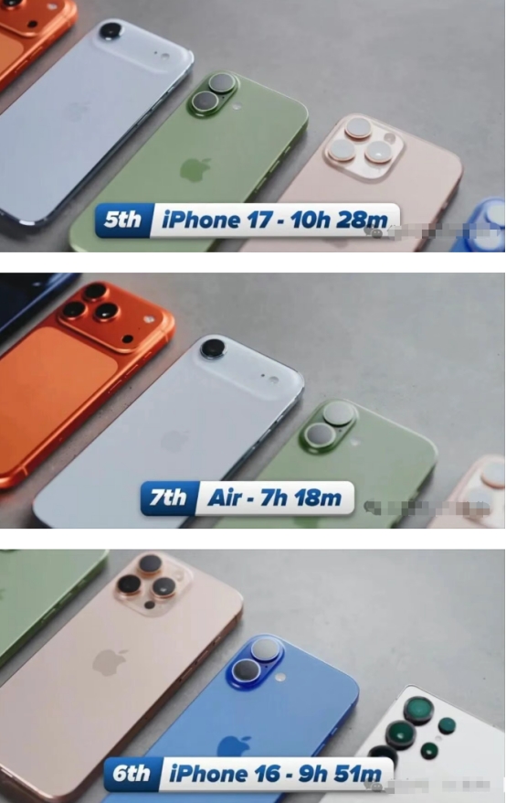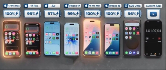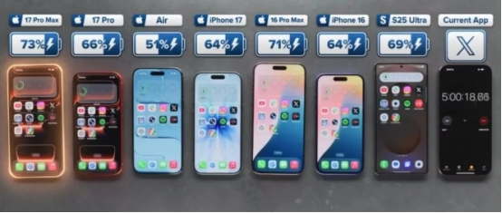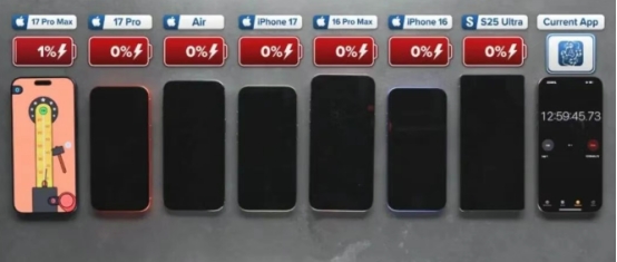 最后真正拼到尽头的,是接近13个小时的时候——iPhone 17 ProMax还剩1%的电,坚挺到了最后。而其他几位选手早就陆续关机了:16 ProMax坚持了12小时15分钟,三星S25 Ultra差不多12小时整,17 Pro是10小时48分钟,17大概10个半小时,16则不到10小时。最薄最轻的Air,最终成绩是7小时18分钟——说实话,比很多人预想的要好一点,正常轻度使用一天两充应该还是能应付的。
