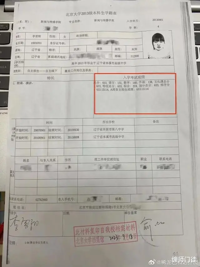 并且晒出了,北京大学的学籍表。从图片来看,真实性是值得肯定的。