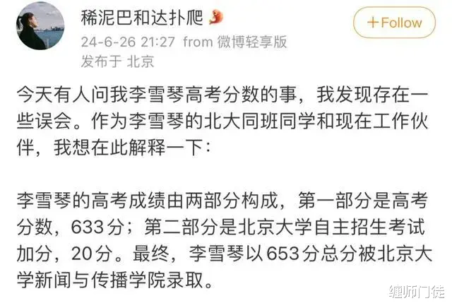 那么,事情简单推理到现在可以了解的是:这个事情,与辽宁本溪、北京大学和李雪琴三方面都有关系。