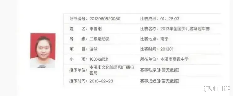 27日,辽宁本溪市体育主管部门工作人员告诉记者,他们已关注到此事,经初步在网上查询,李雪阳符合游泳二级运动员资质。