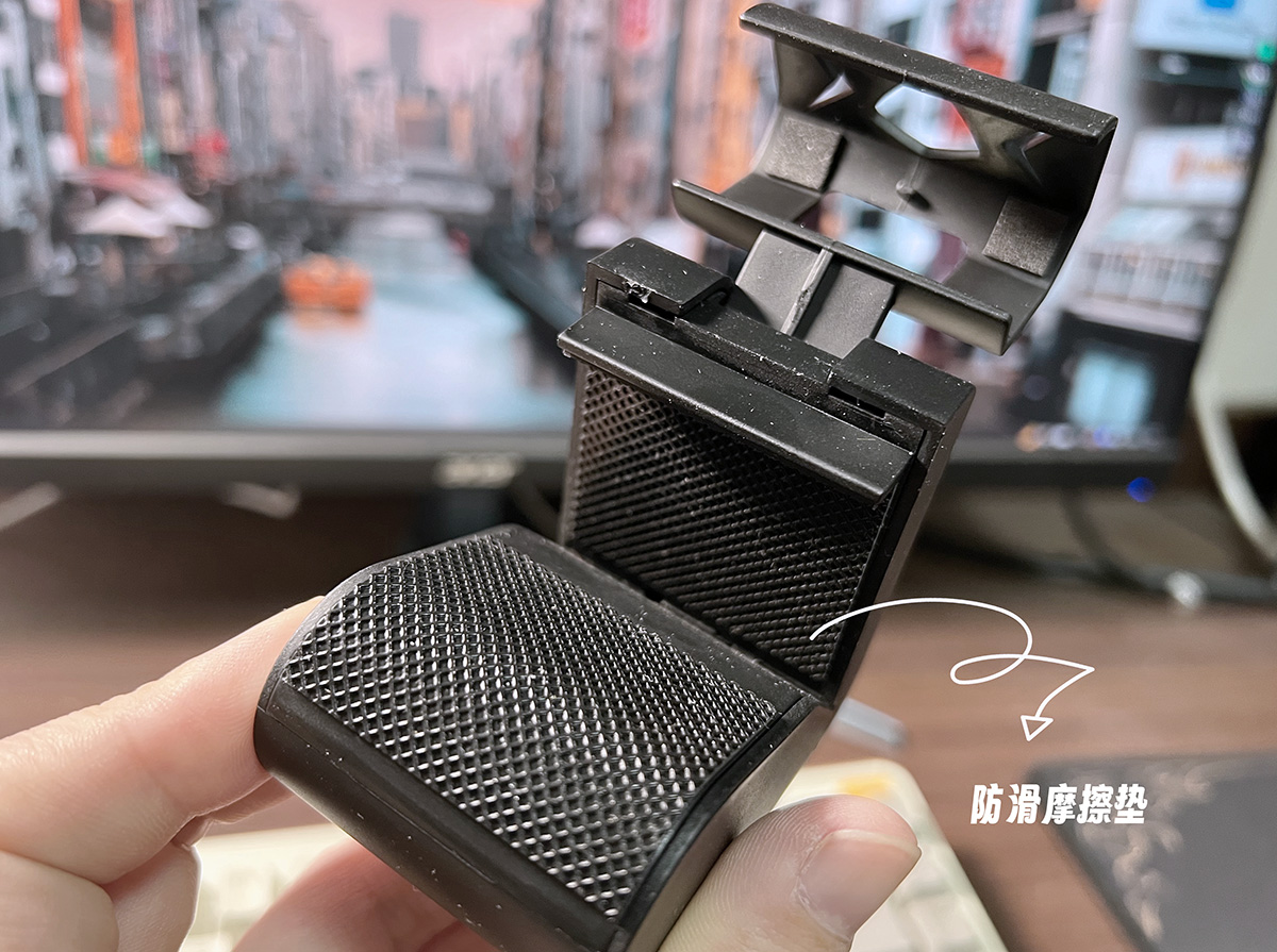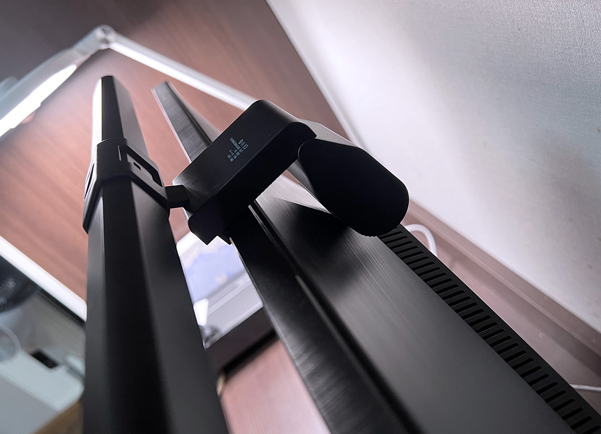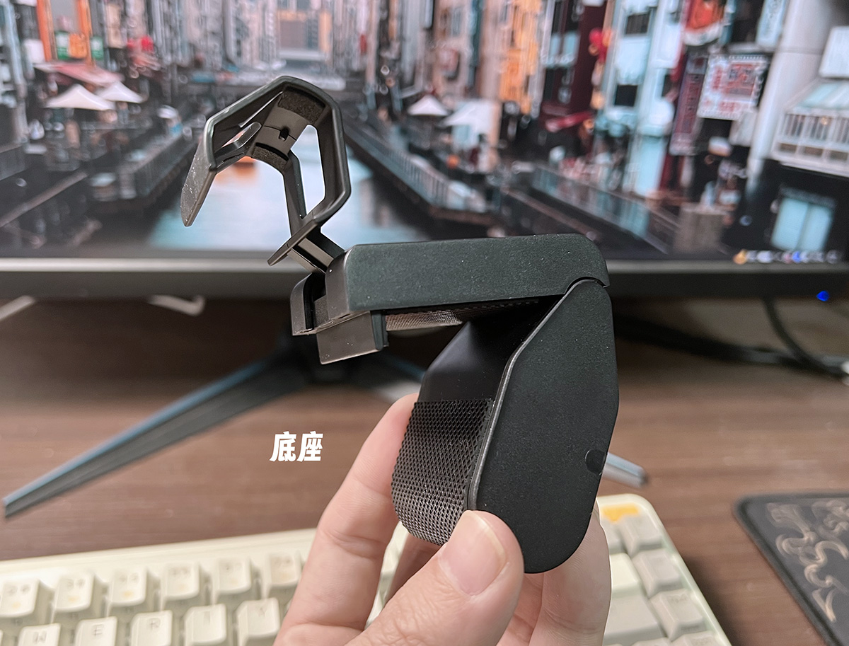 再来看一下屏幕灯的底座,采用的是一种类似三角形的构造,前面卡住灯管,中间部分可以卡在屏幕上,尾部的就像是个配重,平衡头尾中心,