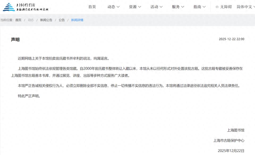 12月22日晚,上海图书馆严正声明,澄清近期网络传上海图书馆拍卖翁氏藏书并牟利一事纯属谣言。“上海图书馆始终依法依规管理各类馆藏。自2000年翁氏藏书整体转让入藏以来,本馆从未以任何形式对外处置该批古籍。这批古籍专藏被妥善保存在上海图书馆古籍善本书库,并通过展览、讲座、出版等多种方式服务广大读者。本馆严正告诫相关侵权行为人,必须立即删除全部不实信息,停止一切传播不实信息的违法行为。本馆将通过法律途径依法追究相关人员法律责任。”