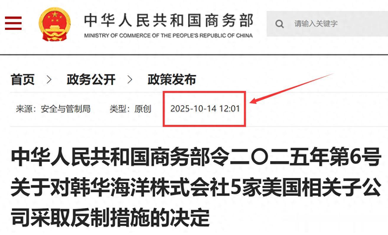 商务部在12:01,发出了《关于对韩华海洋株式会社5家美国相关子公司采取反制措施的决定》。
