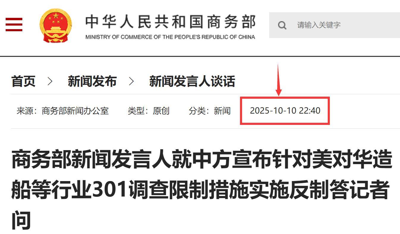 10月14日,美国开始实施对中国海事、物流和造船领域301调查的最终措施,就在落地的第一时间,中方反制措施上路。