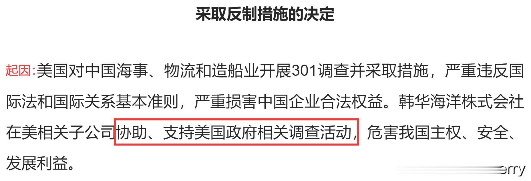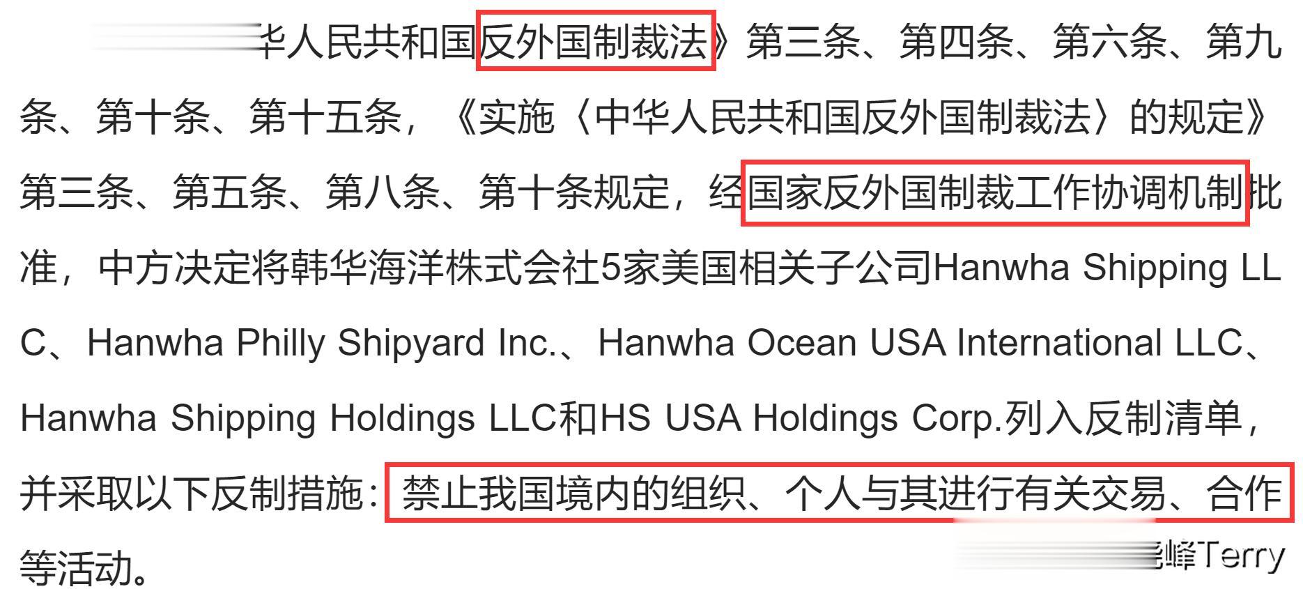 韩华海洋在美业务不是秘密,中方之前顶多只是关注,并没有采取措施。但考虑到美方主动挑起对中国造船领域301调查,中方不得不依据《反外国制裁法》,经国家反外国制裁工作协调机制批准,针锋相对进行反制,韩华海洋注定成为靶子。