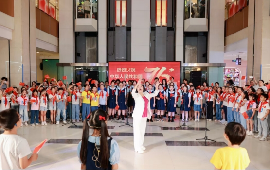 当晚,福州万象九宜城购物中心内人头攒动,市民们沉浸在浓厚的节日氛围中。伴随熟悉的旋律响起,来自福建省音协合唱联盟团体会员福州糖果少儿合唱团、福州市台江区博美诗邦幼儿园及福州市台江区小明星幼儿园的孩子们用纯真而激昂的歌声,瞬间吸引现场人群驻足,不少市民自发加入合唱,以歌声表达对祖国的热爱与祝福,场面温馨感人。