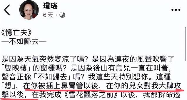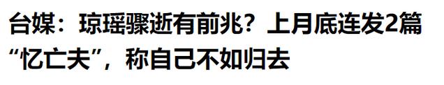 参考信源:2024-12-04 环球时报——台媒:琼瑶骤逝有前兆?上月底连发2篇“忆亡夫”,称自己不如归去