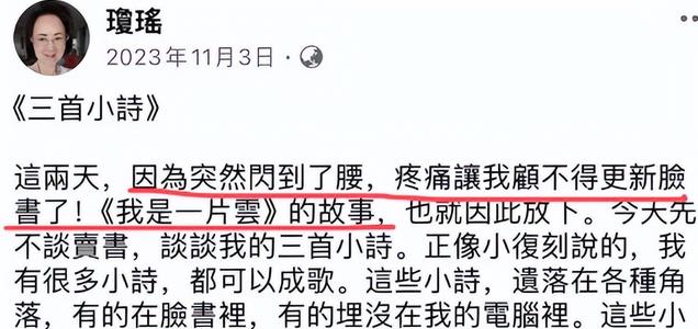 去年的一次意外闪腰,让她的身体遭受重创,剧烈的疼痛使得她无法继续进行小说创作,暂停了《我是一片云》的更新。