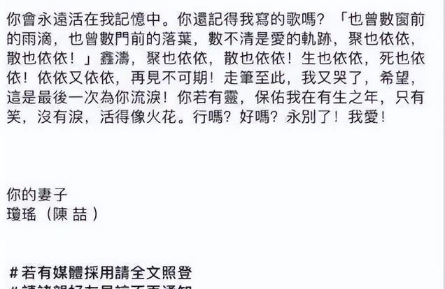 次日,琼瑶再度发文,对阴阳两隔的平鑫涛传达爱念与爱意。