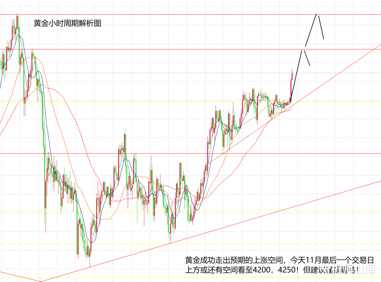 上个交易日山海强调了两点,第一,周四美国感恩节,预计市场行情不大,但也是震荡上行走势,回落可以参考4140的支撑继续做多,等待趋势力度,第二,在多头趋势下,即使周四不涨,周五也会走出趋势力度,所以,暂时对黄金的趋势还是保留期待,上方至少看到4200,如果破位的话甚至看前高4250。虽然周四黄金没有走出力度,但是周五开盘大家可以看到,黄金直线上涨,目前在试探本周强调的4200高点,所以,今天就维持本周的看法不变,坚持看涨黄金到4200,今天如果破位4200的话,再看上方高点4250,甚至更高。当然,今天是11月最后一个交易日,我们要谨慎对待现在的上涨,也有可能会出现月线收线的大范围扫盘震荡,所以,即使现在看涨,也许谨慎对待,不能追涨。从技术面来看,现在不管是日线周期,还是H4周期,都是强势单边上涨的表现,日线周期上方只有4250高点,H4周期布林再次开口,就是极强单边,上涨甚至都不能猜顶,所以,今天延续低多看涨,关注4200,4250两个点,那么,小周期的可能要看一下顶底转换的4170低点,如果亚欧盘回落到这个价位可以继续做多,但也要注意美盘如果跌破4170,就会有大扫盘力度出现,大家注意风险。