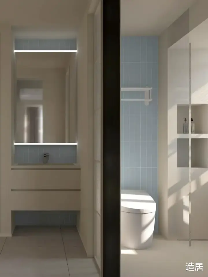 洗澡区改造:在卫生间淋浴区外侧隔出宠物洗澡区,墙面贴耐水瓷砖,地面做排水坡度。搭配折叠式宠物浴盆,不用的时候可以收纳起来。之前一套漳州的80㎡轻奢风改造的业主便在卫生间装了壁挂式收纳架,放宠物沐浴露、梳子这些用品,随用随取很方便。