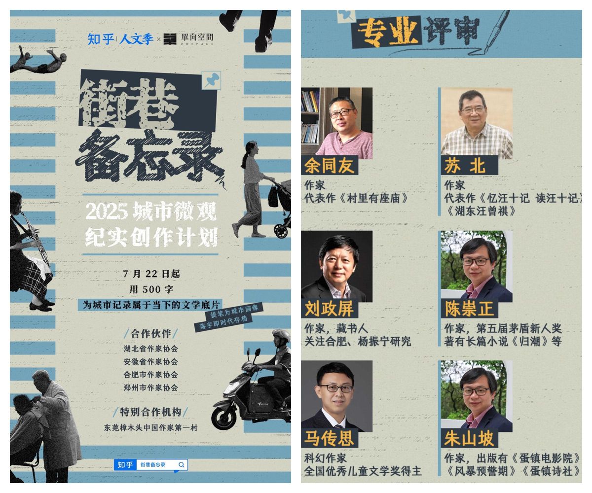 此次“街巷备忘录—2025城市微观纪实创作计划”由知乎联合湖北省作协、安徽省作家协会、合肥市作家协会、郑州市作家协会以及东莞樟木头“中国作家第一村”共同发起,邀请每一位生活的观察者,用文字捕捉城市的温度与棱角。