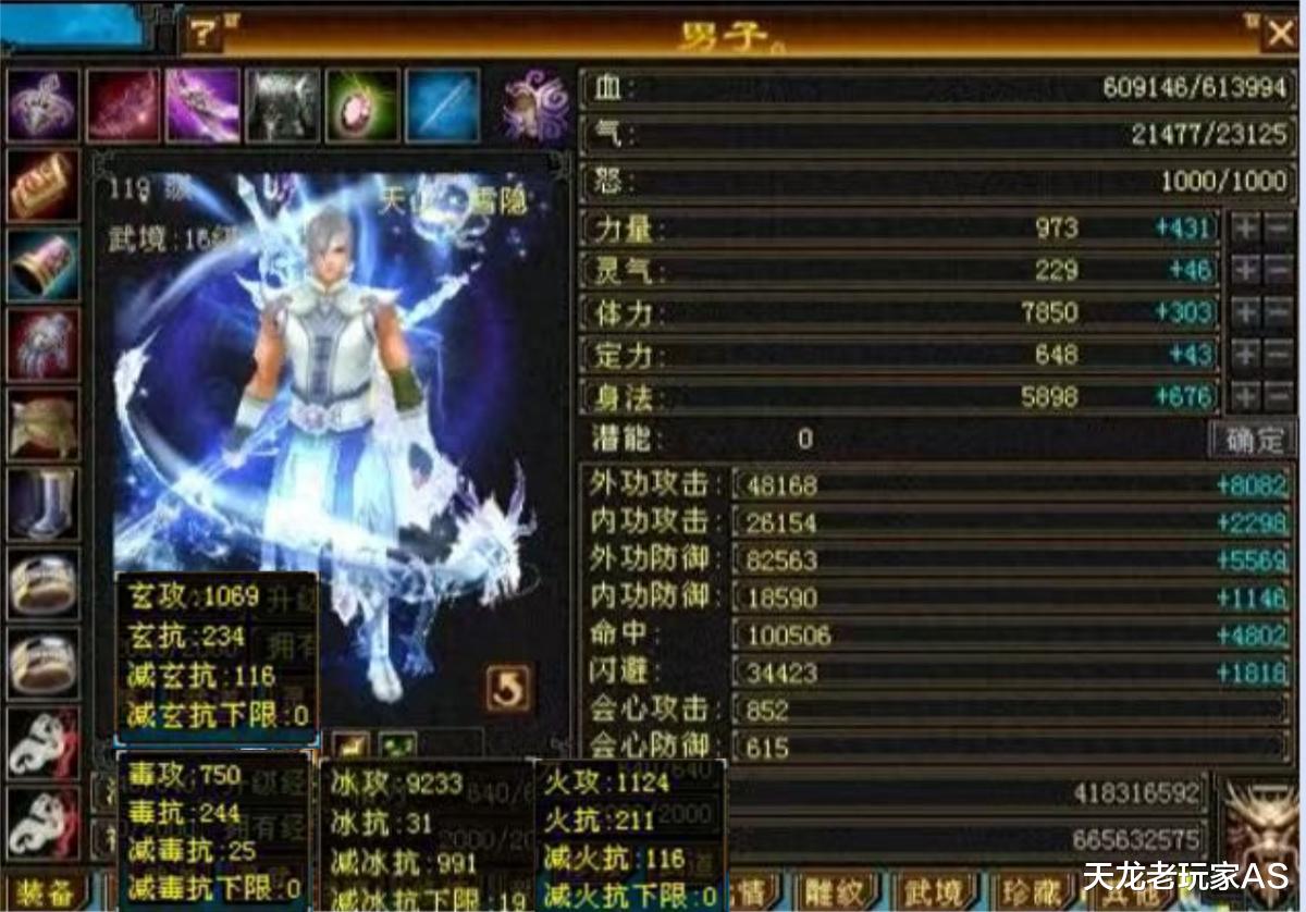 先上面板:血量61万,外功攻击4.8万,命中10万,闪避3.4万,会心攻击852,会心防御615,主冰攻击9233,玄攻击1069、毒攻击750,火攻击1124!