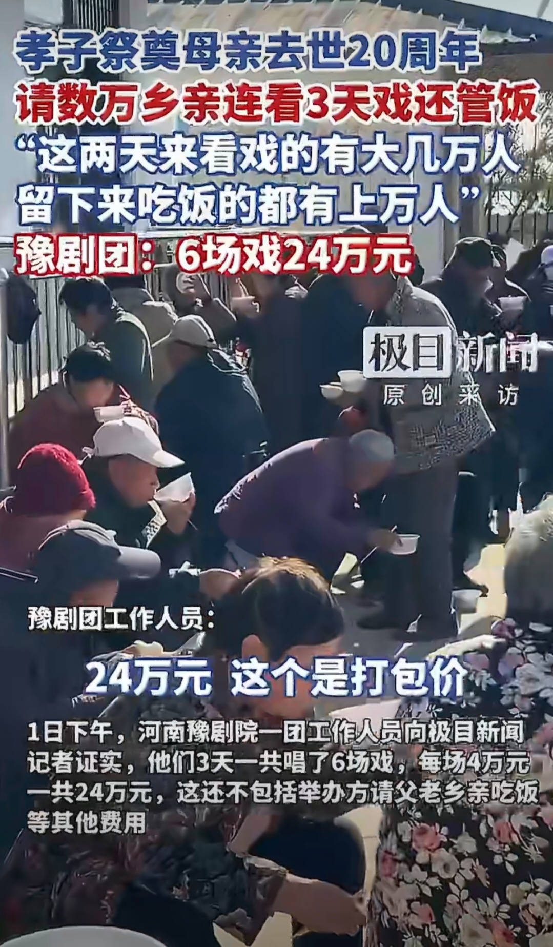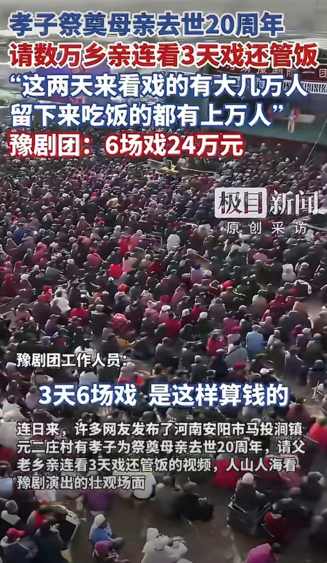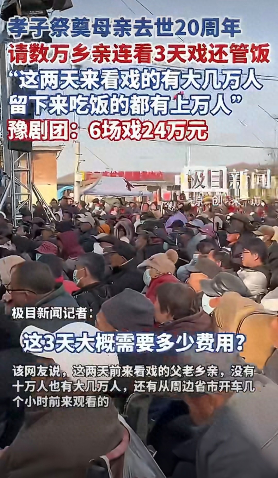 12月1日至3日,河南安阳市马投涧镇元二庄村上演三日六场豫剧盛宴,数万村民齐聚围观。这场由当地孝子为纪念母亲去世20周年举办的“文化大餐”,不仅耗资24万元,请来河南豫剧院一团倾情演出,更免费为观众提供餐食,成为寒冬里最温情的乡村图景。