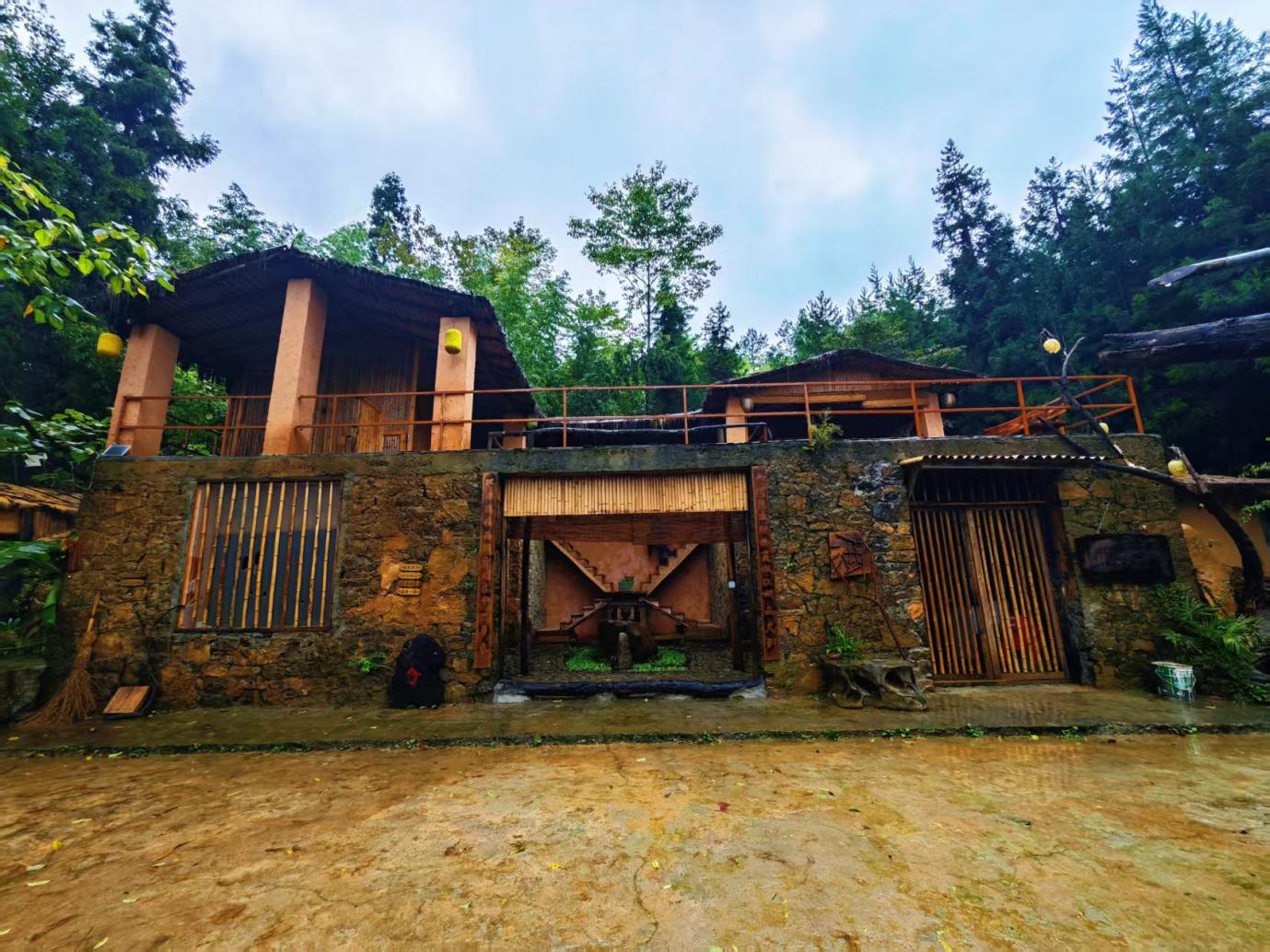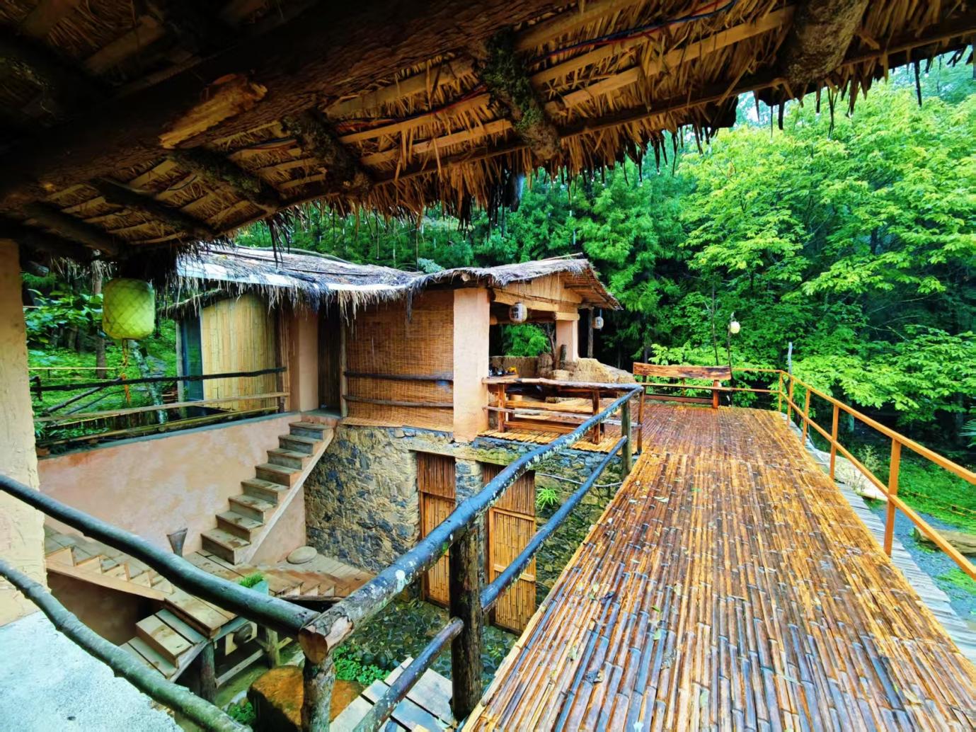 傍晚,夕阳金辉透过林隙洒在石墙上,给粗粝石块镀上暖光,木梯阴影被拉得修长,与竹篾平台纹理交织成画。坐在平台木桌旁,泡一杯当地野茶,看暮色从山林深处漫上来、将草堂温柔包裹,会忽然懂得:这里的 “隐” 从不是与世隔绝,而是让身心重新锚定在自然节律里,让每一次呼吸都与林风、草木同频。