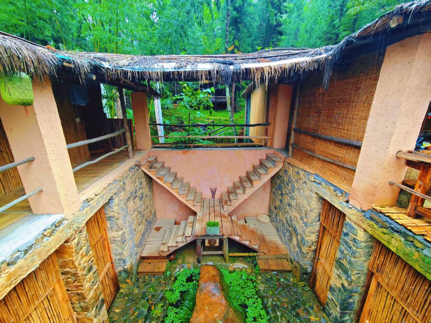 踏入草堂,“隐” 的智慧在空间里层层铺展。交错的木梯最是动人,它们不循规蹈矩,顺着建筑高低错落自由生长,木踏板被岁月与脚步磨得光滑,踩上去发出 “吱呀” 轻响,像山雀掠过枝丫的私语。半开放的庭院中,石涧潺潺穿流,涧底铺满圆润石子与碧油油水草,几株蕨类从石缝探出头、沾着晶莹水珠;竹篾铺就的平台沿石墙延伸,阳光透过茅草缝隙漏下,在竹面上投下斑驳光斑,风一吹,光斑如碎金在木栏、石墙上跃动。
