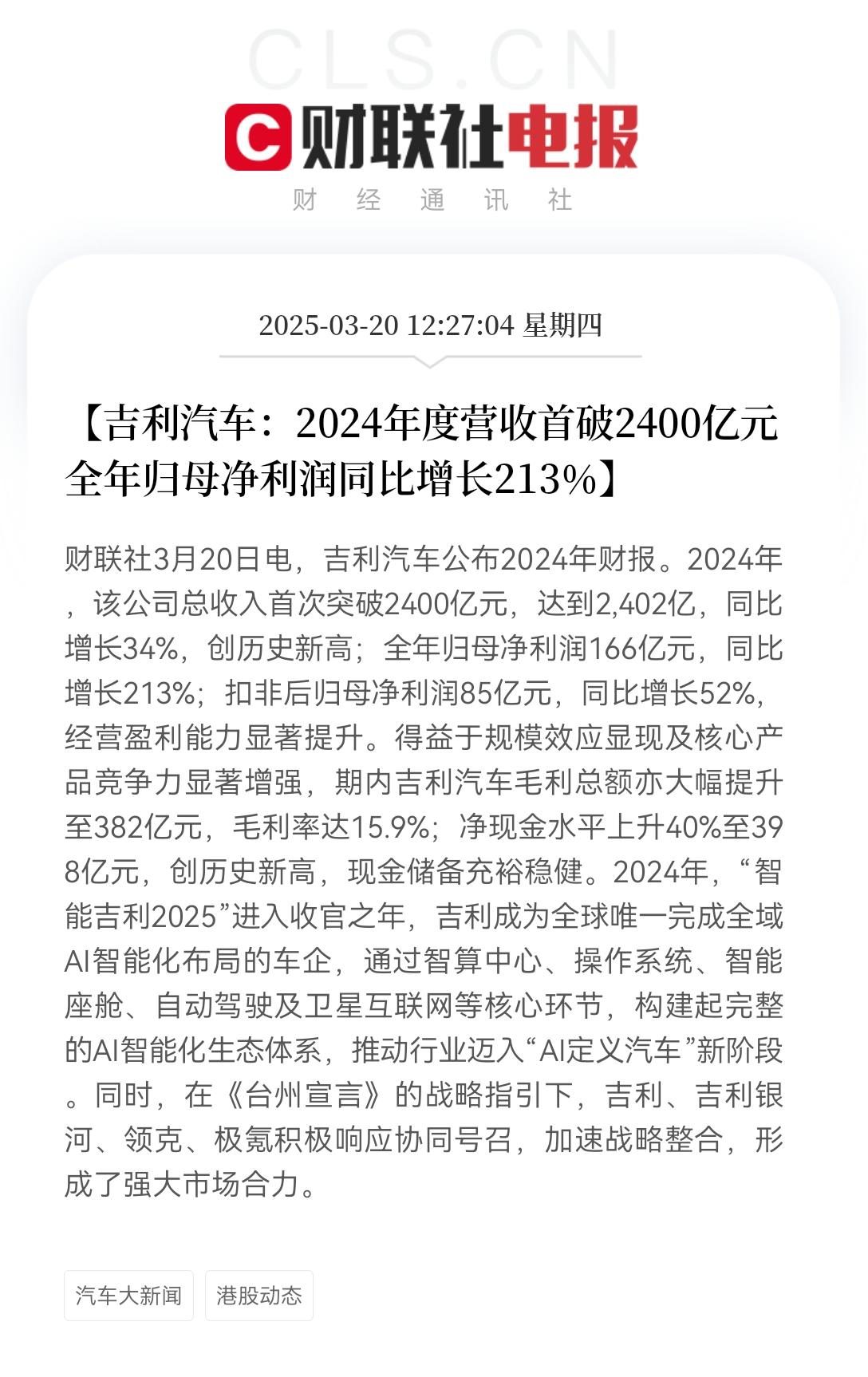 想不到吉利要怎么输!各家车企2024财陆续出炉,吉利汽车以营收2402亿元、净利润166亿元的“史上最强”业绩,稳居国产车企TOP,新能源销量88.8万辆,渗透率超50%