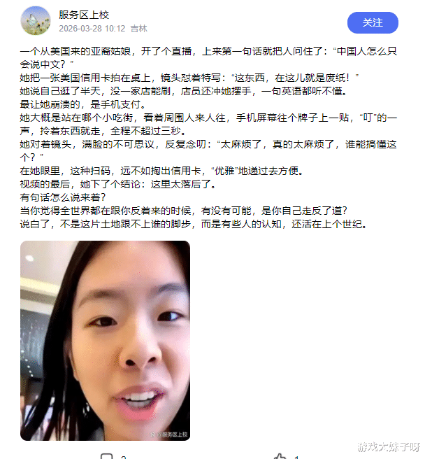 从她的成长背景来看,这种困惑并非完全无法理解,她在美国长大,习惯了以英语为主的语言环境,也接触到多语言并存的社会氛围,因此潜意识里将“会多种语言”等同于“更国际化”,但问题在于,她忽略了最基本的语境差异,语言的使用,从来都是和环境强绑定的,在中国,以中文作为主要交流语言,是再自然不过的事情,就像在美国以英语为主一样,这是社会运行的常态,而非“落后”的体现。