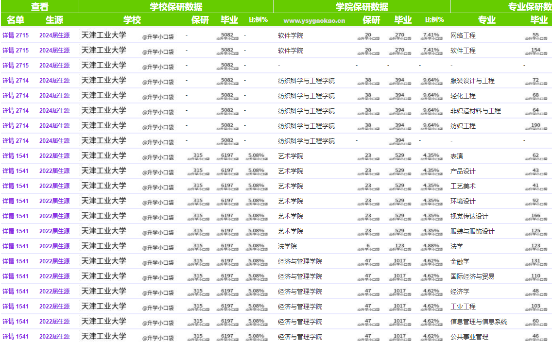 2023年升学的学生人数中,升学到一流大学建设高校的人数所占的比例为26.01%,升学到一流学科建设高校的人数所占的比例为57.45%。留在天津工业大学继续学习的学生人数为305人,天津大学录取的学生人数有91人,南开大学录取了24人,东北大学录取了17人,中国科学技术大学录取了16人。