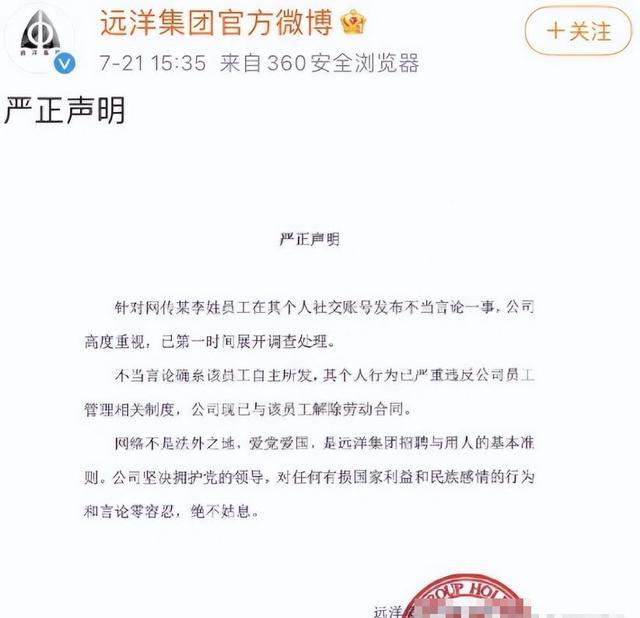 远洋集团赶紧发了个声明,说跟李睿的劳动合同不续了,他那年薪百万的工作说没就没了。