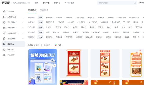 丰富的模板资源:涵盖京东、拼多多、淘宝、天猫、抖音、快手、1688等多个平台所需的设计素材,直接使用即可完成作品制作。